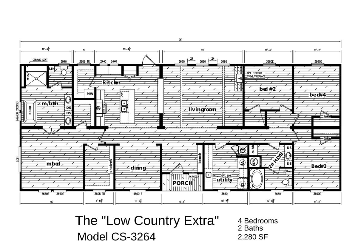 BEDS: 4     BATHS: 2.00     SQ FT: 2280     W X L: 32’ 0” x 80’ 0”